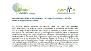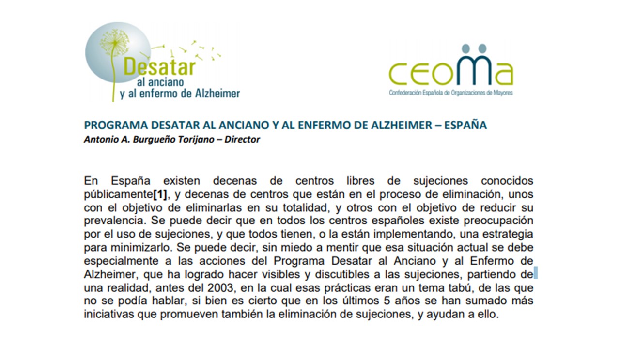 Desde hace años, en el ámbito de la atención geriátrica existe una corriente, cada vez más generalizada, que propugna la necesidad de eliminar las contenciones / sujeciones. Desde 2003, el Programa Desatar al Enfermo de Alzheimer, impulsado por la Confederación Española de Organizaciones de Mayores- CEOMA viene sensibilizando a profesionales y a la sociedad sobre esta materia, al tiempo que acredita centros libres de sujeciones, al igual que la Fundación Cuidados Dignos a través de su Norma Libera Careo la Fundación María Wolff, que no solo ha dedicado su atención a las sujeciones físicas o mecánicas, sino también a las sujeciones químicas o farmacológicas, con el desarrollo de unos criterios al respecto. A nivel legislativo, en 2011, la Comunidad Foral de Navarra abrió camino, refiriéndose no solo a la atención geriátrica, sino también a la de personas con discapacidad, mediante su Decreto Foral 221/2011, de 28 de septiembre, por el que se regula el uso de sujeciones físicas y farmacológicas en el ámbito de los servicios sociales residenciales, complementado tres años después con la Orden Foral 186/2014, de 2 de abril por la que se aprueba el protocolo para el uso de sujeciones en los centros residenciales de tercera edad y discapacidad.