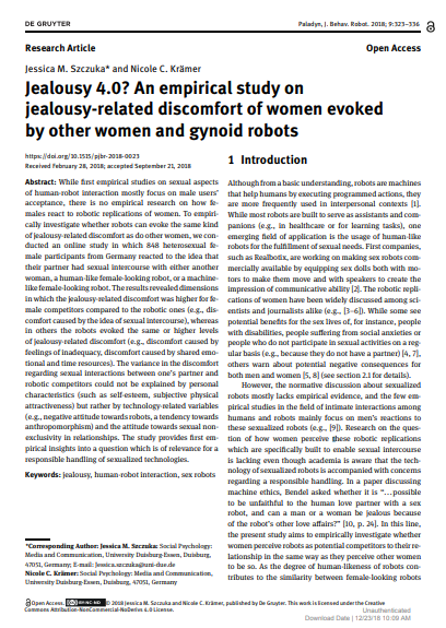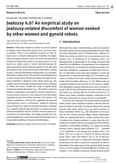 Szczuka JM, Krämer NC. Jealousy 4.0? An empirical study on jealousy-related discomfort of women evoked by other women and gynoid robots. J. Behav. Robot. 2018; 9:323–336
