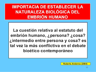 Con respecto a los problemas éticos del inicio de la vida, en todo lo que tiene que ver con el estatuto del embrión nos dice: “El hecho de que el embrión tenga determinado potencial no significa que podamos perjudicarle, en el sentido que podemos perjudicar a un ser que tiene necesidades y deseos o puede sufrir. Lo que significa realmente, si el embrión no realiza ese potencial, es que no vendrá al mundo un ser humano concreto”.