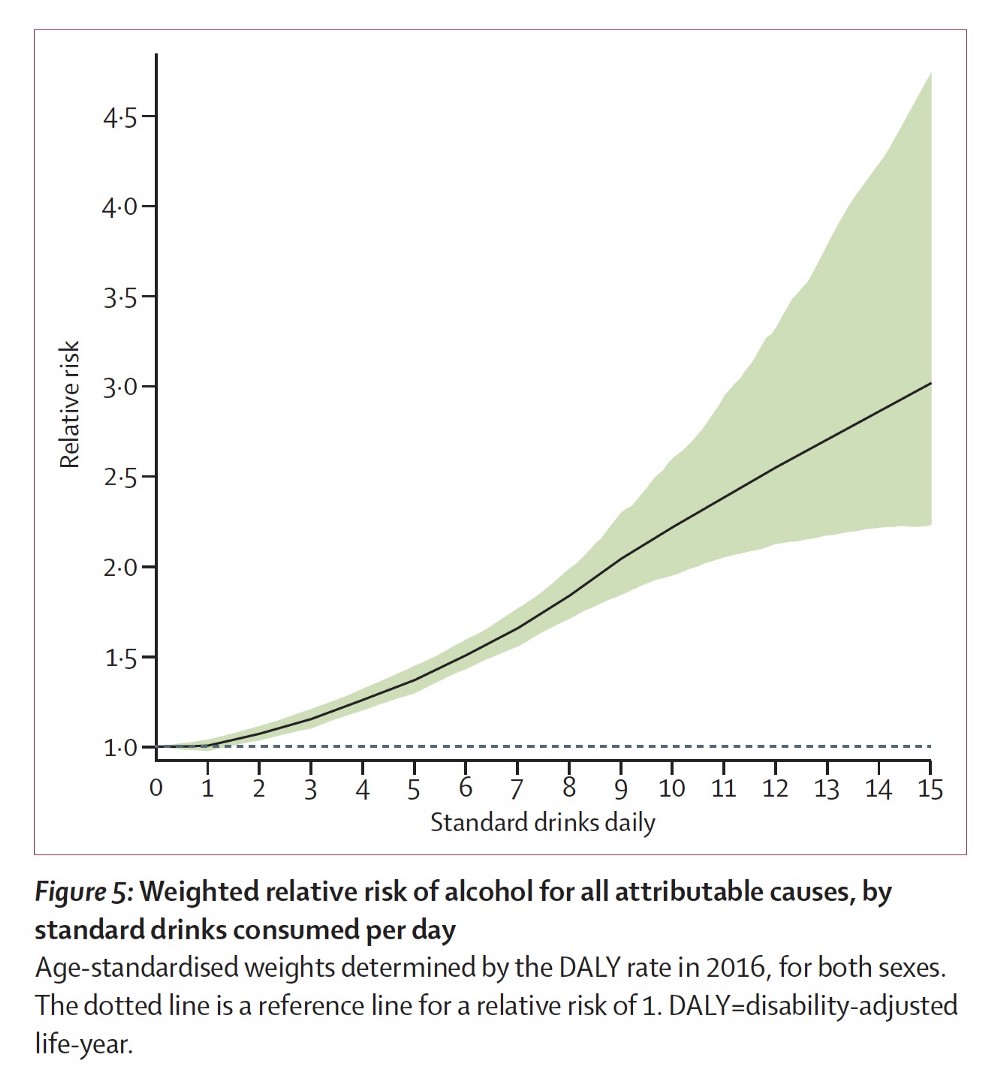 Para llegar a esta conclusión construyeron un modelo estadístico a partir de una amplia gama de fuentes de datos, incluyendo una gran variedad de países. En resumen afirman que aunque el consumo moderado de alcohol puede ser preventivo para algunas enfermedades, (pensemos en la cardiopatía isquémica y la diabetes), nos hace mas vulnerables a accidentes y otras enfermedades como el cáncer. La figura que acompaña sintetiza como a partir de una sola unidad de bebida, el riesgo relativo de padecer alguna entidad mórbida o accidente ya aumenta en relación a la población abstemia.