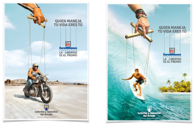 1.- Lotería del Estado: “quien maneja tu vida eres tu; la libertad es el premio”. Antes de proseguir, amigo lector, tómese un minuto observando y pensando en esta imagen… ¿Cuál es el mensaje que se le hace llegar?, ¿para qué? Póngase en la piel de un espectador “medio”, no en la piel de un filósofo, ni en su propia piel, (su género, edad y profesión sesgarán en gran medida la manera de “ver” estas imágenes). Llamemos a esta interpretación la “principal”, la que posiblemente el anunciante quiere hacer llegar a un gran público. Y ahora trate de encontrar otras interpretaciones, interpretaciones alternativas que pueden condicionar (e incluso traicionar) esta interpretación que hemos llamado “principal”. Imagínese que es usted pobre de solemnidad, o que usted tiene el género opuesto al que de veras tiene, o si es persona de edad que usted es joven (o viceversa). Si es usted gitano siéntase payo, y viceversa. Si es blanco crea ser negro… etc. Haga lo que podríamos denominar “esfuerzo de empatía” … ¿cambia este significado “principal”?
