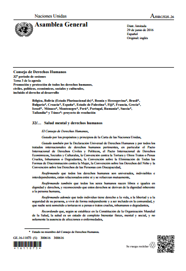 Emitida por el Consejo de Derechos Humanos de la Asamblea General de Naciones Unidas, la resolución “reafirma la obligación de los Estados de promover y proteger todos los derechos humanos y las libertades fundamentales y de asegurarse de que las políticas y los servicios relacionados con la salud mental cumplan las normas internacionales de derechos humanos”.