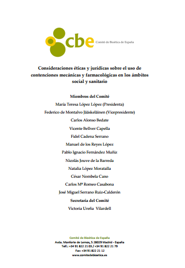 Elaborado por el Comité de Bioética de España, este informe propone la aplicación de estas medidas solo en el caso de que sean imprescindibles, y que antes de llegar a indicarlas se deben buscar otras alternativas. Asimismo, plantea que las contenciones físicas o farmacológicas deben contar con consentimiento informado escrito.