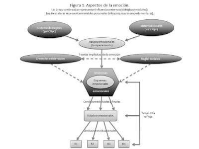 *Pasemos ahora a la parte media de la figura. El genotipo y sociotipo de una persona, junto con las experiencias de ese individuo conforman sus esquemas emocionales. Son las predisposiciones a responder de determinada manera propias de cada uno. Cabe diferenciar rasgo emocional de estado emocional (el primero perdura en el tiempo y el segundo no). Los esquemas emocionales configuran la manera de sentir de cada cual, es decir, el carácter. Volveremos a estos esquemas un poco mas adelante.