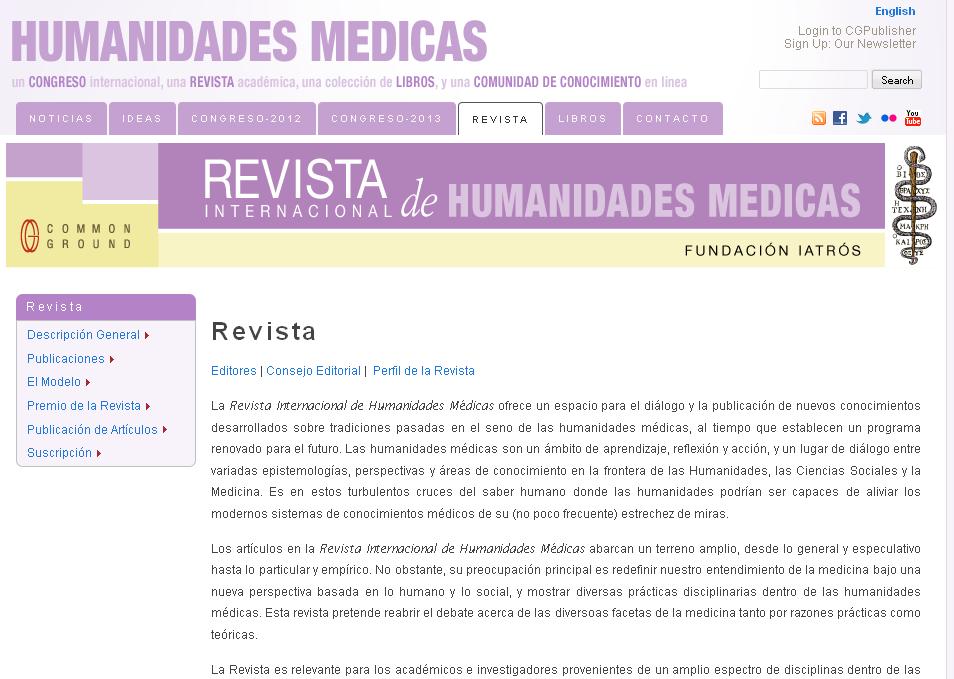 El reciente acuerdo entre la Fundación Iatrós de Teoría de la Medicina y la filial española de la empresa Common Ground Publishing ha dado lugar a la creación de una Revista y un Congreso Internacional de Humanidades Médicas, dirigidos a todos los países de lengua española y portuguesa. Se realizarán en coordinación con el correspondiente congreso y revista que ya organiza Common Ground Publishing en lengua inglesa: la International Conference on Health, Wellness and Society y The International Journal of Health, Wellness and Society Iinformación detallada en: http://humanidadesmedicas.com/conference-2013/