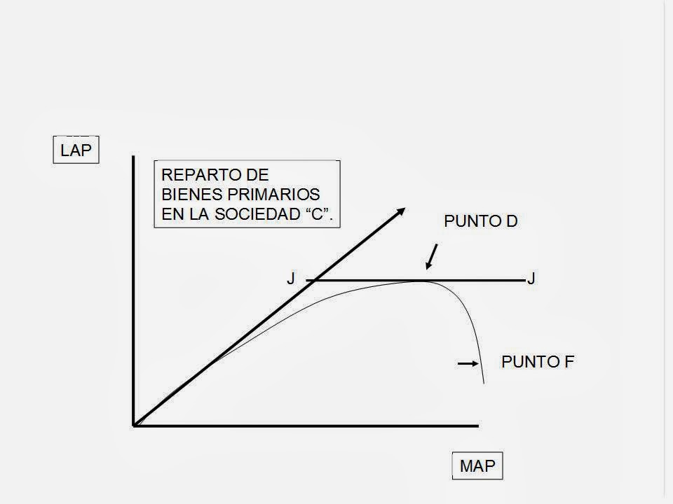 Profundizando algo mas en estas curvas de equidad/inequidad podemos considerar en la figura 3 la línea JJ (tangente al punt “D” y paralelo al eje de ordenadas). Este punto D sería el punto de máxima igualdad para esta sociedad “C”, el más próximo a la recta de 45 grados. A partir de este punto los MAPs ganarían mas bienes primarios pero los LAPs ganarían menos (imagine el lector lineas paralelas a JJ, pero mas bajas), y el llamado por Rawls “principio de la diferencia”, no se cumpliría. Este principio, recordémoslo, nos dice que es tolerable la desigualdad siempre que revierta en un mayor confort (o beneficio) de los LAPs. Llegaría un momento en que esta sociedad llegaría al punto “F”, un punto en que ya no hay ganancias para los MAP, por el efecto desigualdad que hemos mencionado, aunque quizás se aumentara la productividad global.